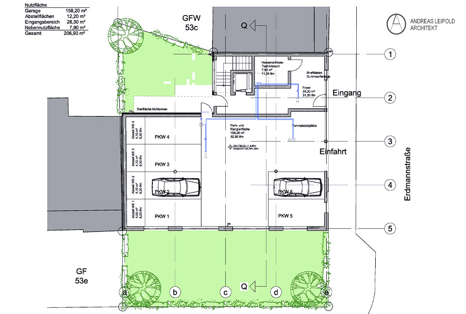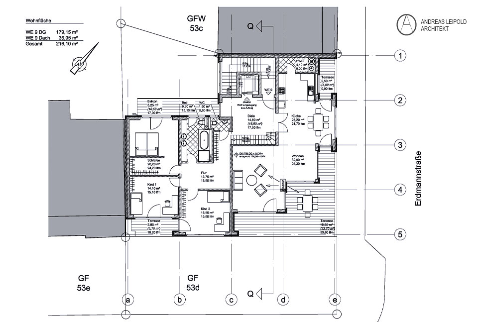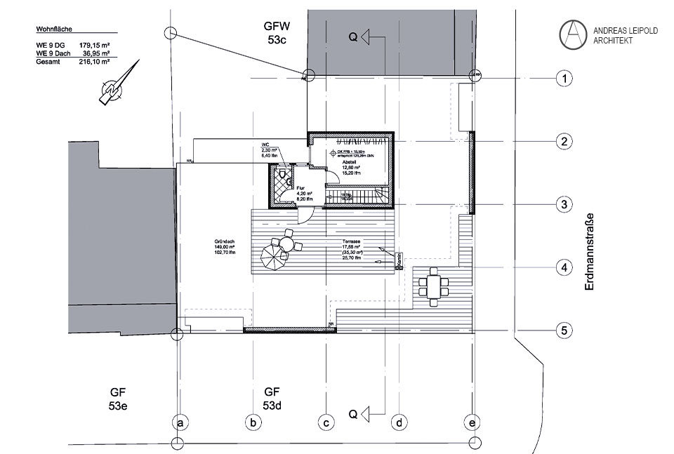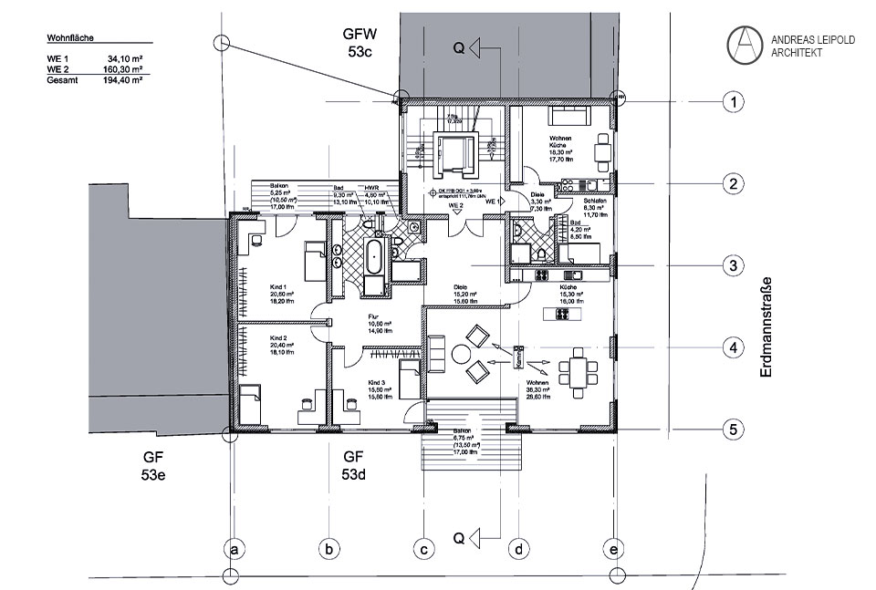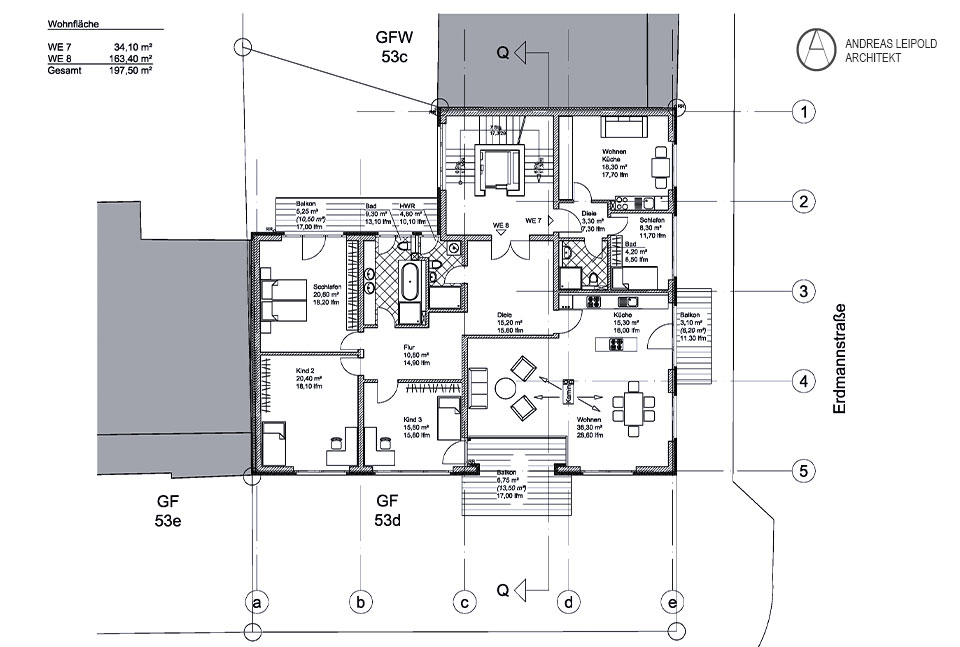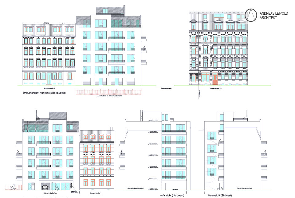 Auch mit einem Raster lässt sich eine anspruchsvolle Eckbebauung beplanen! Die einzige „Überraschung“ bei dem Projekt war, dass nach Konzeption des Eingangs auf die Erdmannstraße, sich der Projekttitel Nonnenstraße änderte. An Wohnungsgrößen stehen eine große Etagenwohnung, eine kleine Zwei-Zimmer und eine große Vier-Zimmer-Wohnung sowie zwei Drei-Zimmer-Wohungen zur Auswahl.