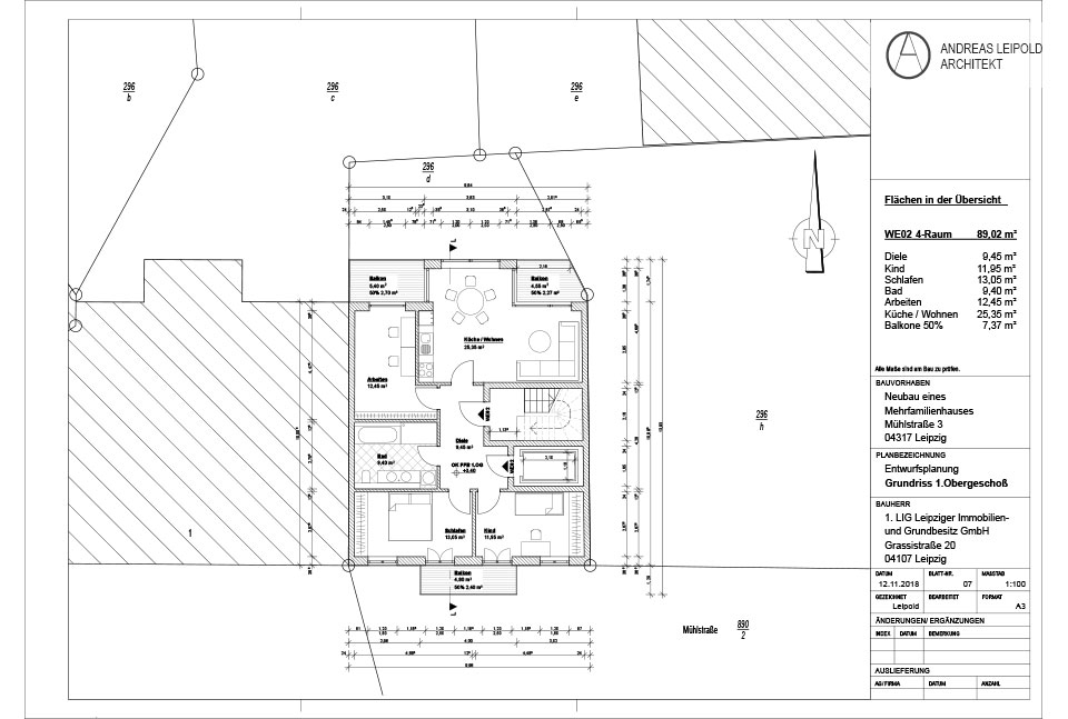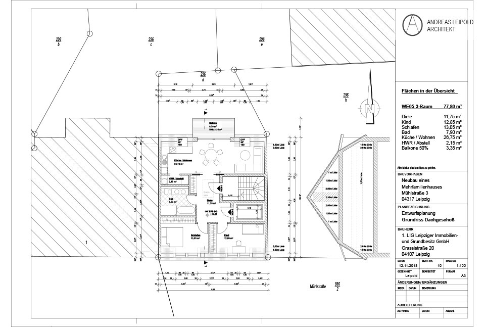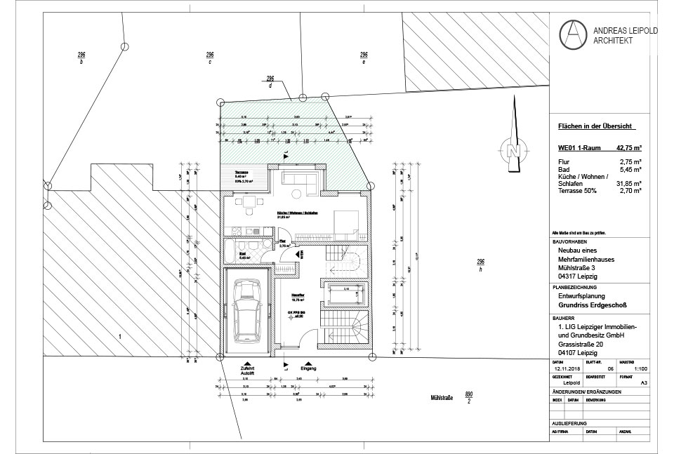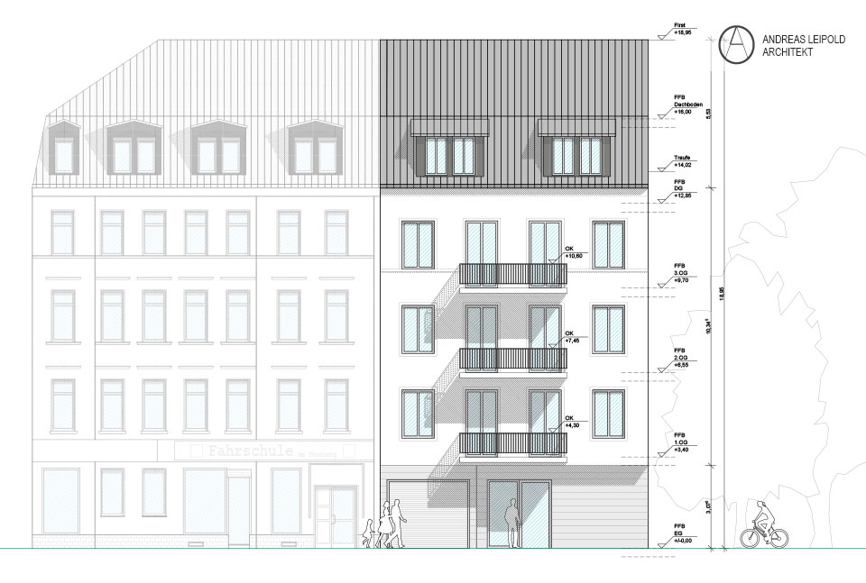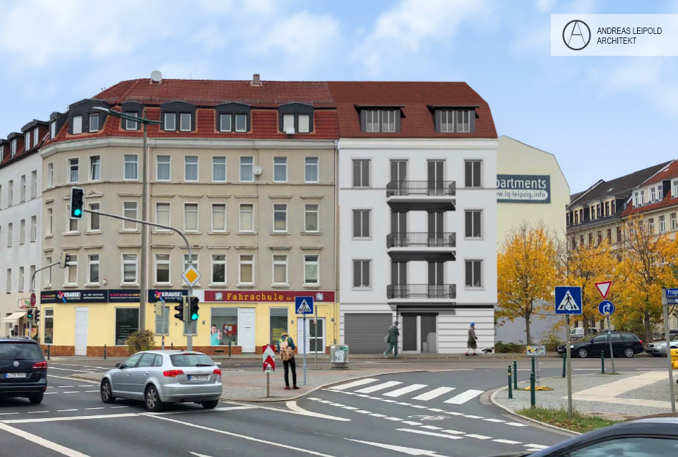 Entwurf eines Mehrfamilienhauses in der Reudnitzer Mühlstraße mit fünf Geschossen und fünf Wohneinheiten.